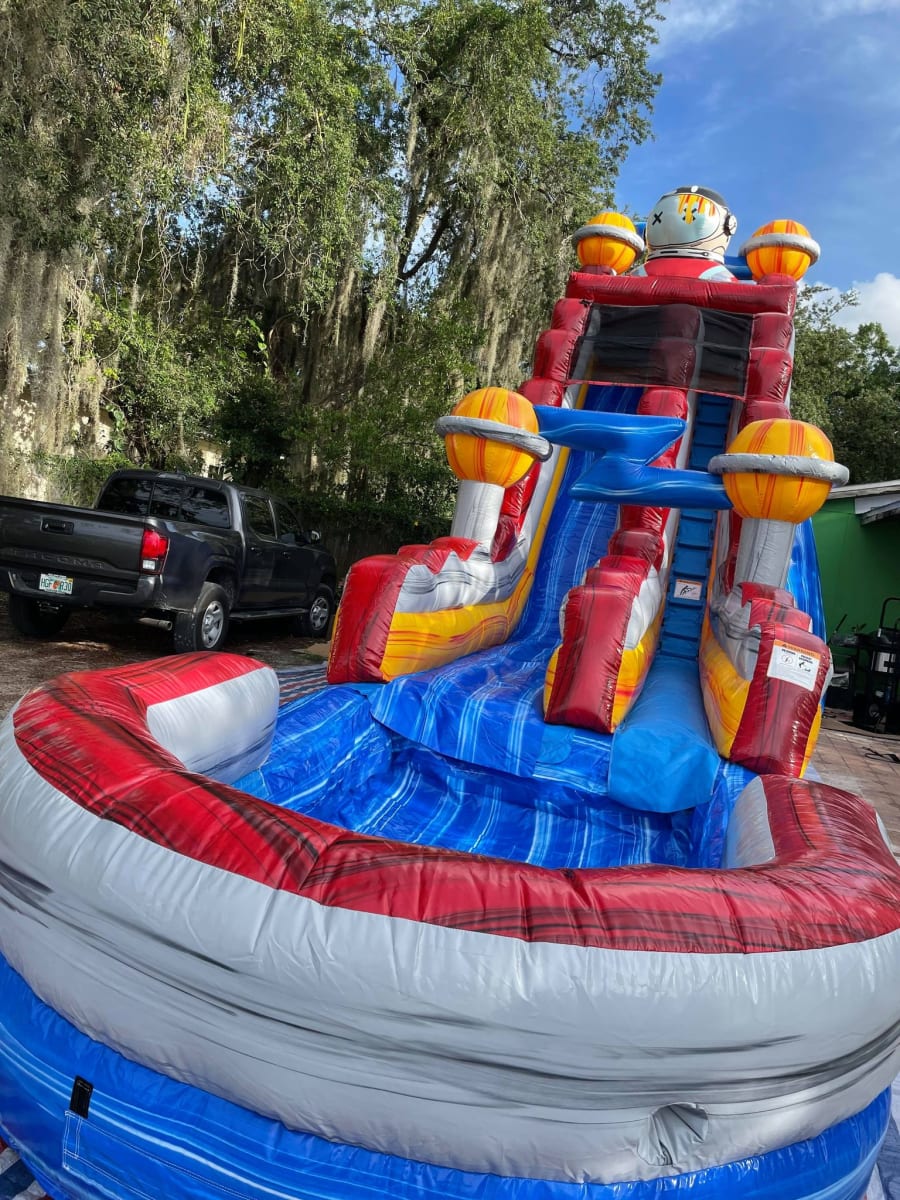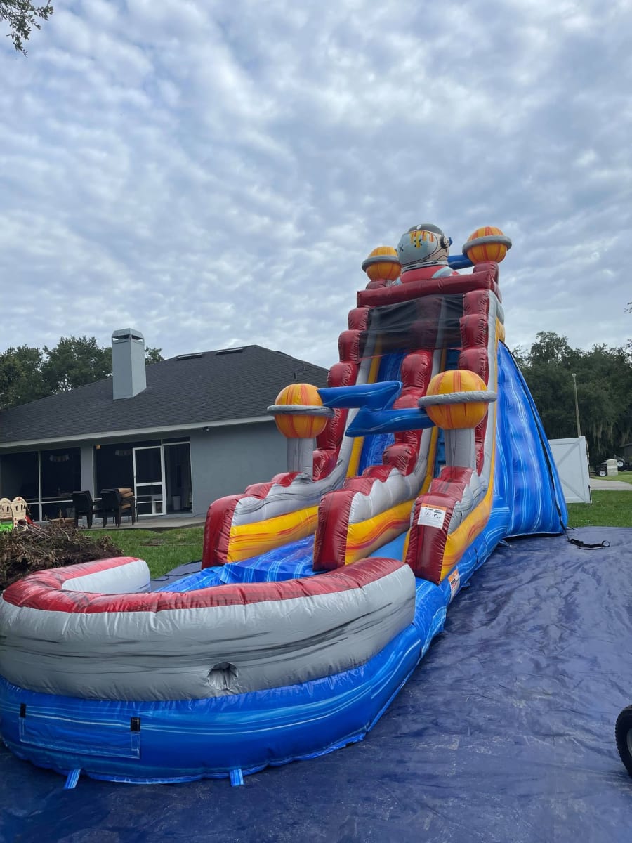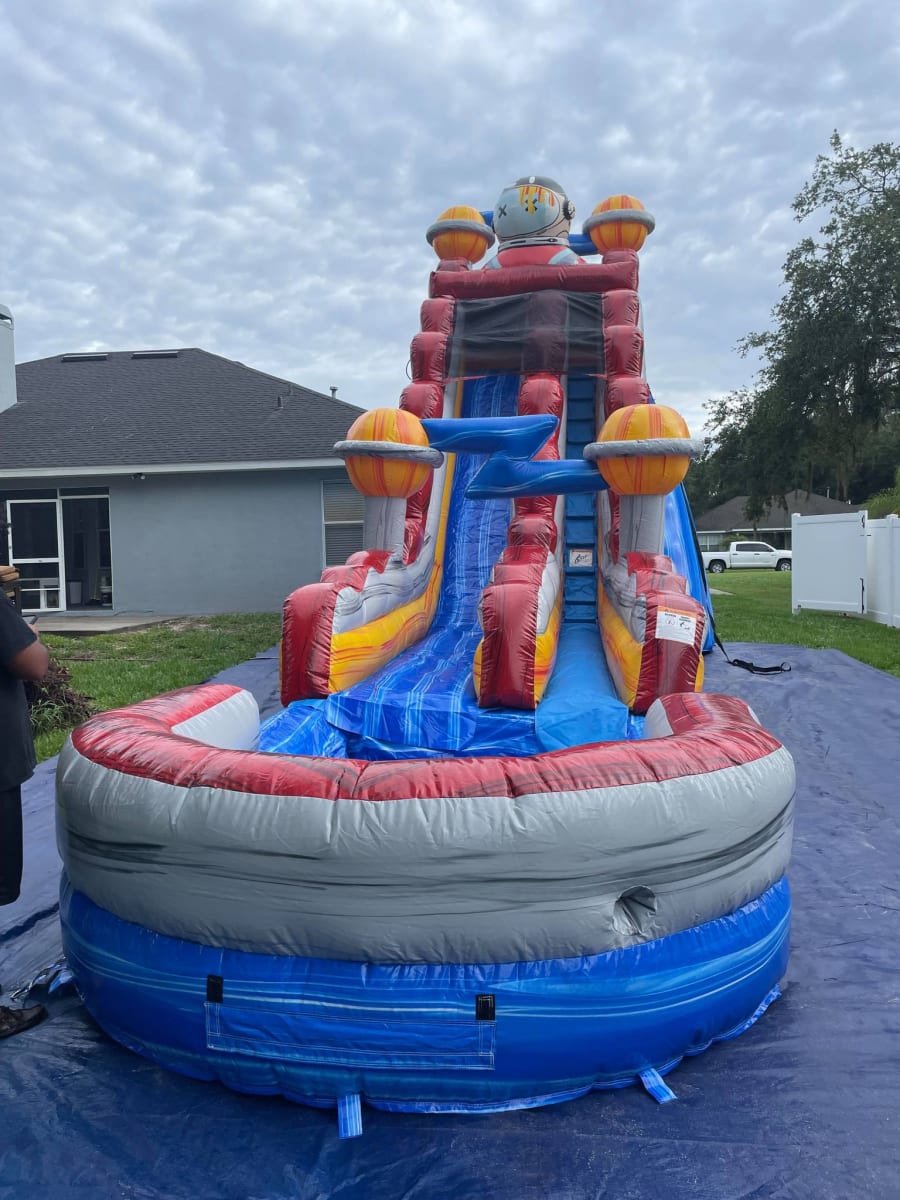 Blast off into a world of fun and excitement with our Astronaut Waterslide! Perfectly designed for adventure seekers and space enthusiasts, this single-lane waterslide offers an exhilarating ride that ends with a splash in a large pool. Standing at an impressive 19ft tall, it's the ultimate addition to your party or event, promising to elevate the excitement to astronomical levels!