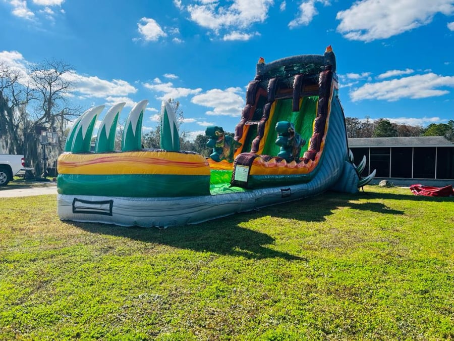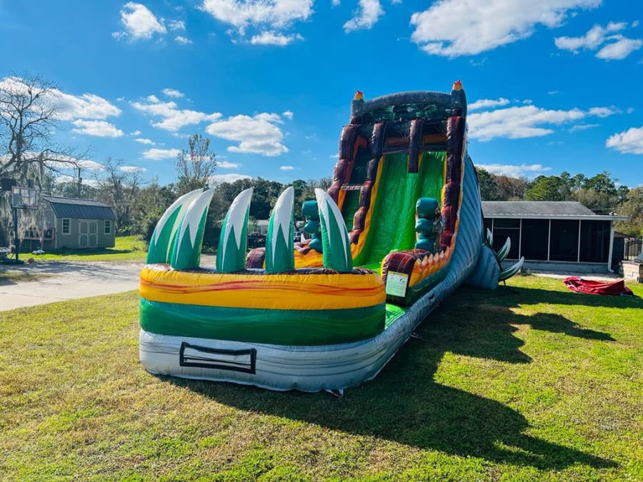 Make your next party or event unforgettable with our 22ft Dual Lane Dino Dive Waterslide, the ultimate attraction for thrill-seekers. This prehistoric-themed waterslide is perfect for creating a splash at any gathering, offering a unique blend of excitement and fun for guests of all ages. The impressive dinosaur design paired with dual lanes ensures double the fun, allowing two participants to race down simultaneously into the large, refreshing pool.